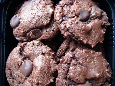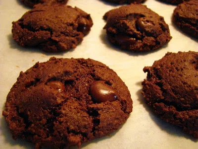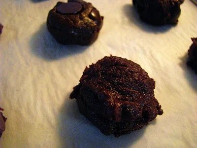 A few weeks ago, during my Food in Jars phase, I found a link for a recipe on Mostly Foodstuffs. All of Deena's recipes look totally amazing, and I was mentally and with iPod bookmarking these chocolate chocolate chip cookies to try. I finally had no dessert by yesterday, since I didn't have room in the fridge and I left my plum cake on the counter under the dome...and it developed mold! I was shocked. And after only 2 days! I think its demise was due to the weather, since it's been kind of humid here, and it is a moist cake due to the fruit...but still. The only good thing about its premature departure is that it rendered me dessertless, and I finally had a reason to make these: