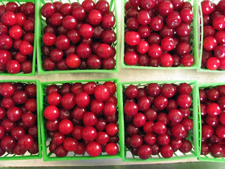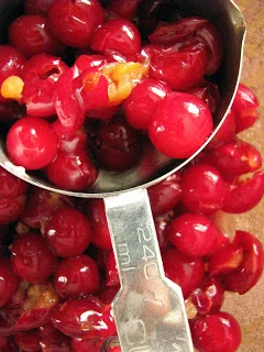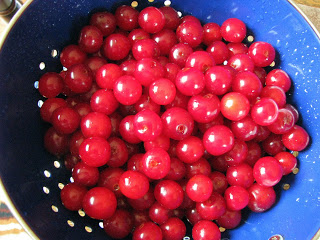 It has been one week now since my total and complete obsession with cherries. Last Saturday when Elisa and Laura were here, I happened to try some tart cherries at a farm market. I was a goner. I bought 2 baskets, and half of 1 was probably missing by the time we walked back through my door. Since, I've been back twice. Yesterday I bought 8 more, since I was warned by the super nice farmer that the end is nigh.