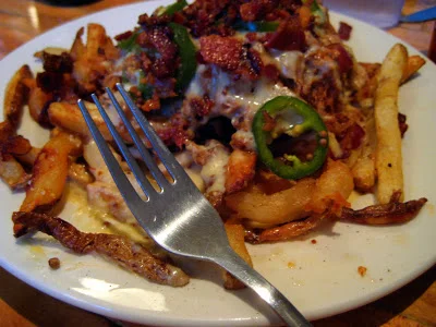 I actually wasn't even hungry, I was meeting friends. I did end up ordering the pork fries, fitting for a place with a "pig in a bib" on their logo... (Incidentally, my little boy-o loves saying "pig in a bib" and then laughing hysterically ever since we first saw the sign.) Pork fries are going to be my new guilty pleasure since they are delicious fries topped with BBQ pork, a cheese sauce and I'm guessing jalapenos pickled with coriander seed. Oh, yes, and then topped with bacon. I'm fairly certain this plate could have fed me for 3 days: